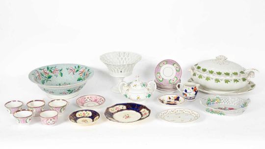 A quantity of ceramics, comprising a group of pink lustre-decorated teawares, a Dresden oval basket, a Booths Vine Leaf pattern soup tureen, cover, stand and ladle, a white glazed footed basket, and a large circular bowl, 35cm diameter