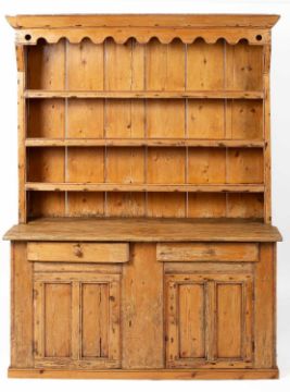 An Irish pine dresser, the wavy cornice above three shelves, the base fitted two drawers above cupboards, 147cm, 46cm deep, 188cm high