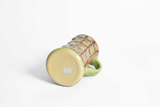 Paul Young (Contemporary) a slip decorated tankard with sprigged decoration in brown and green glazes, 17cm x 10cm