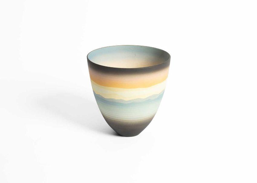 Peter Lane (born 1932) a porcelain 'Sky Series' bowl, 1995, with graduated landscape design in black, blue, yellow and pink glazes, signed to base,16cm high