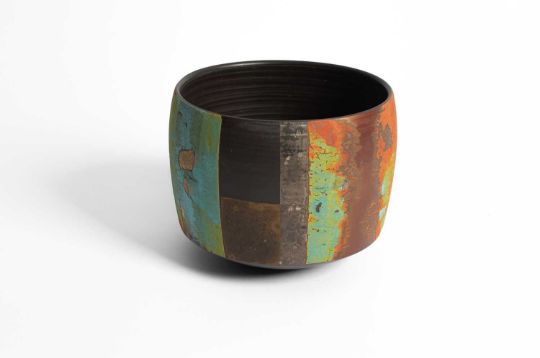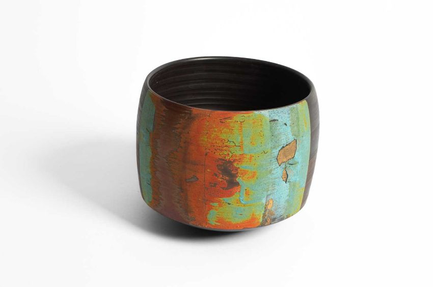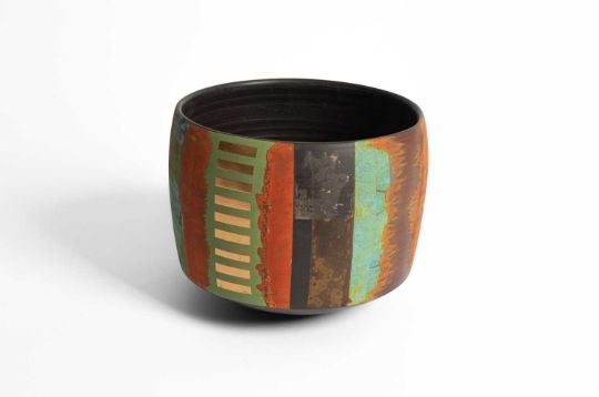 Tony Laverick (born 1961) a globular black porcelain vase with orange, green, brown, turquoise and gold lustre abstract decoration, initialled TL and dated 16,19cm high