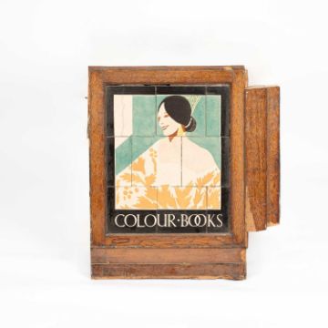 A tiled W. H. Smith advertising sign, depicting a lady and titled 'Colour Books', in original oak frame, 45.5cm x 38cm, with frame 66cm x 59cm