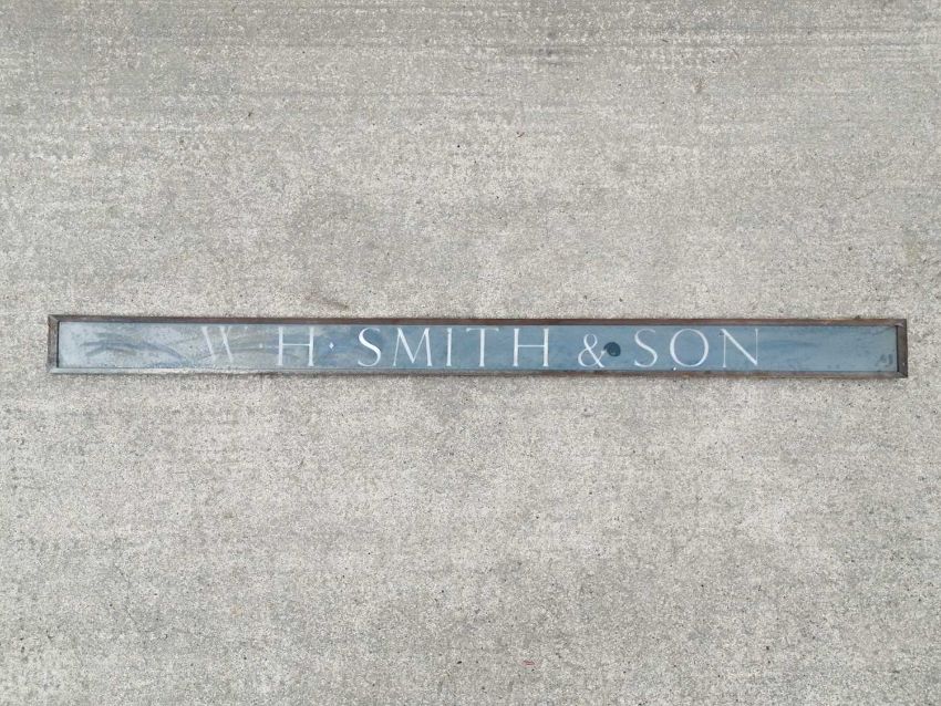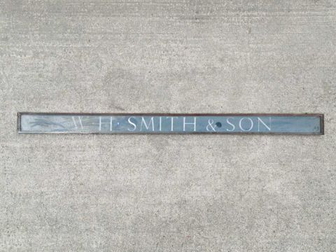 A W. H. Smith & Son acrylic sign with white lettering against a blue background reading 'W. H. Smith & Son' within a beech frame, 15cm wide, 217cm high